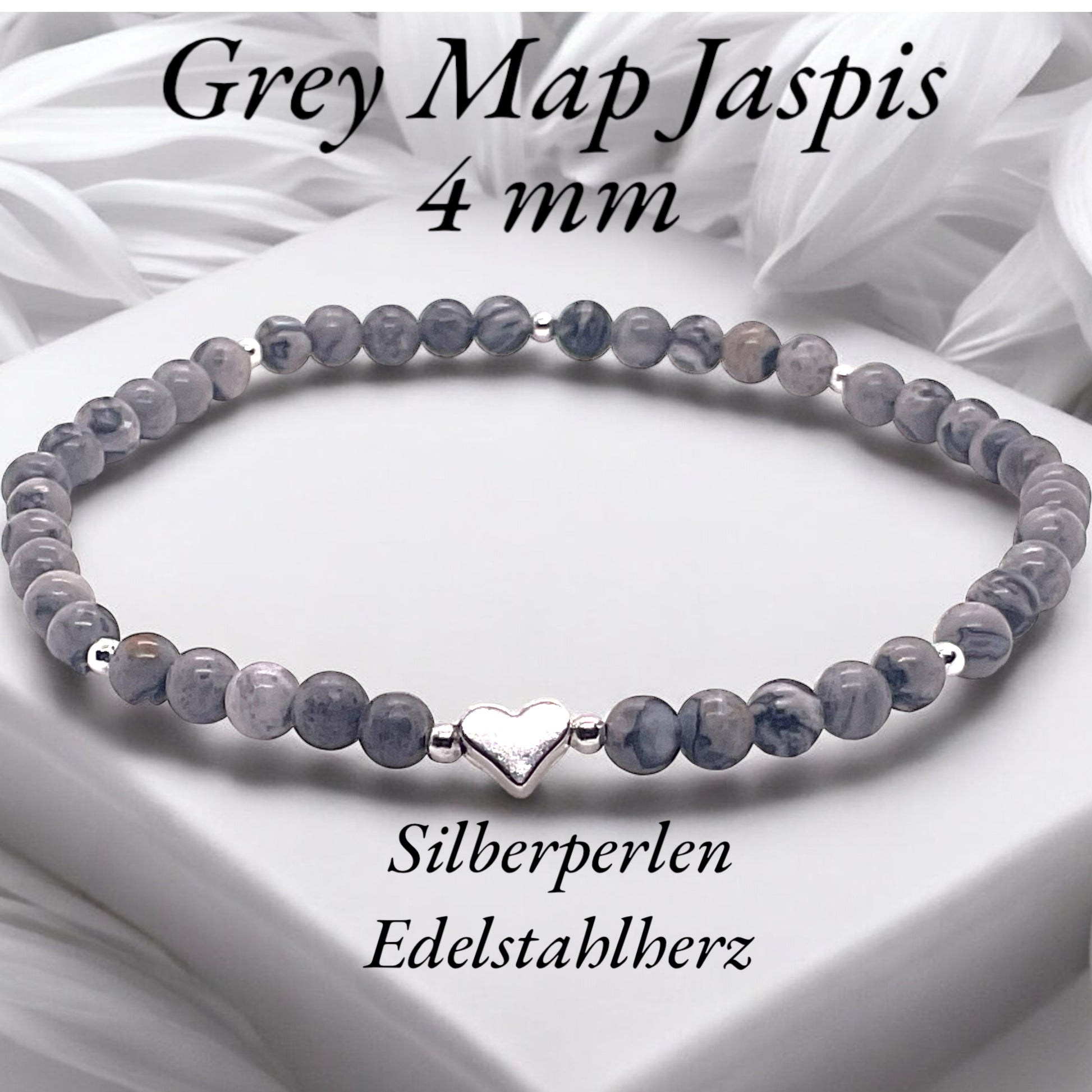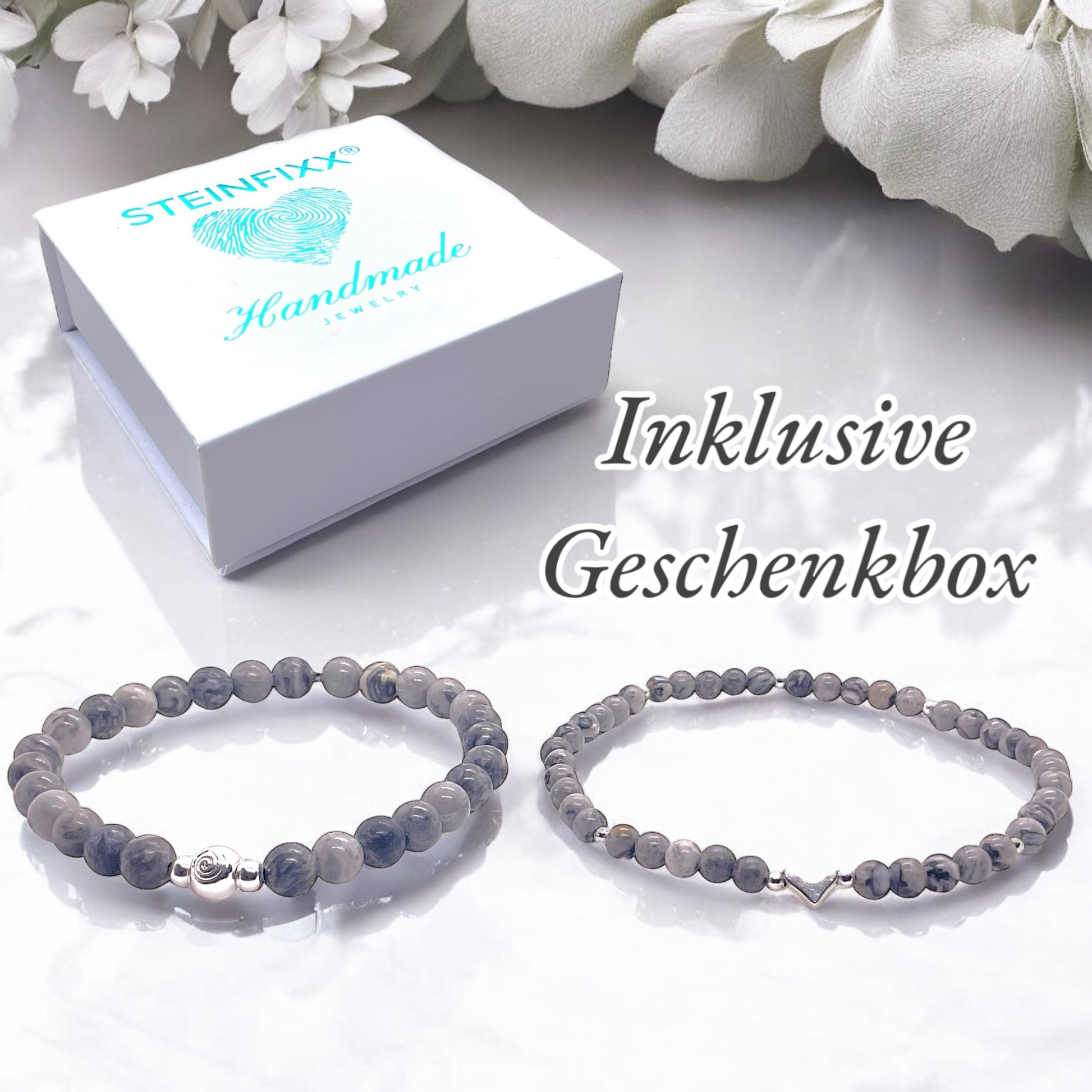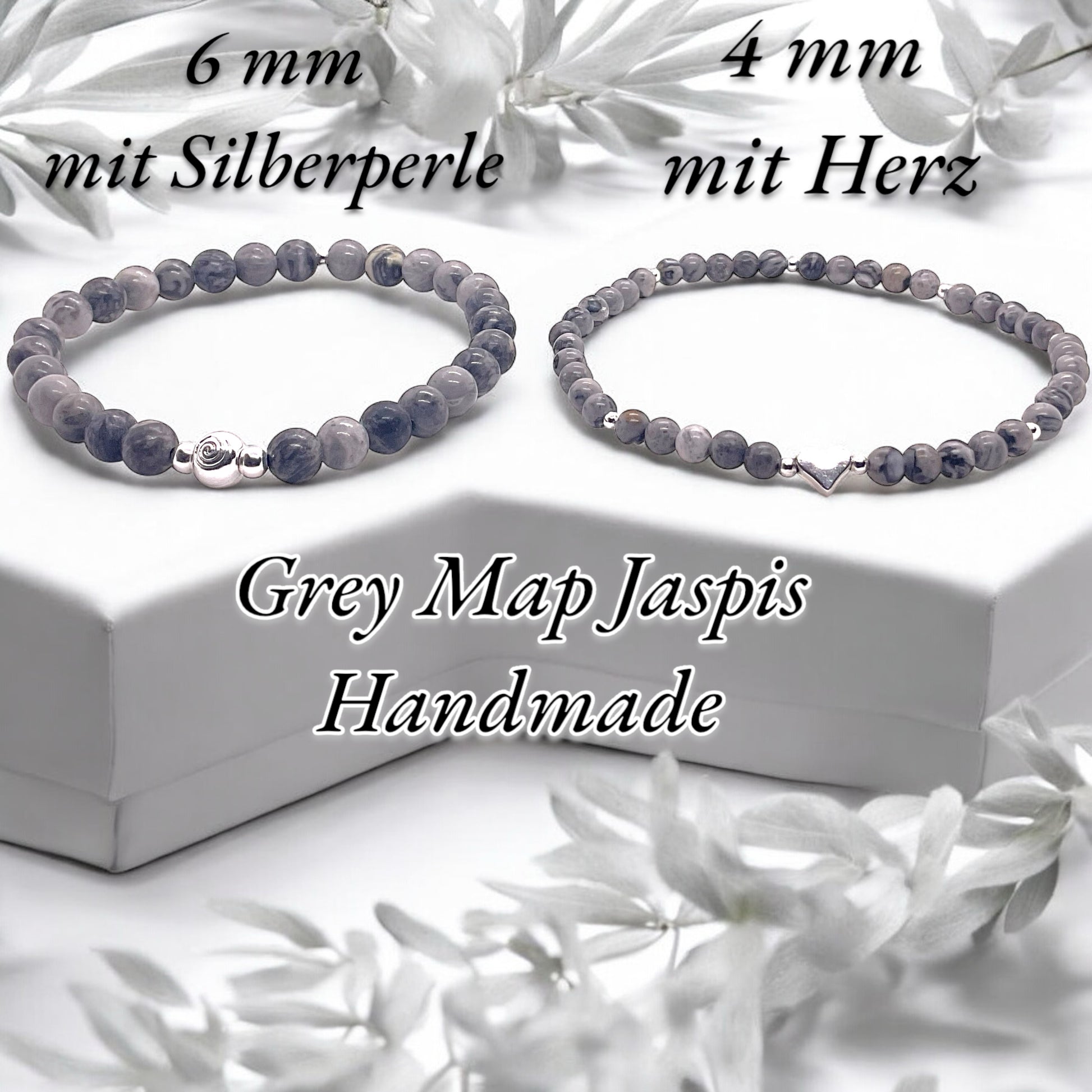 Edelstein Perlenarmband aus grauem Picasso Jaspis - Hochwertige Heilsteine mit 925 Silberperlen oder Herzchen - handgefertigt - in Geschenkbox - Kreativität und Entschlossenheit