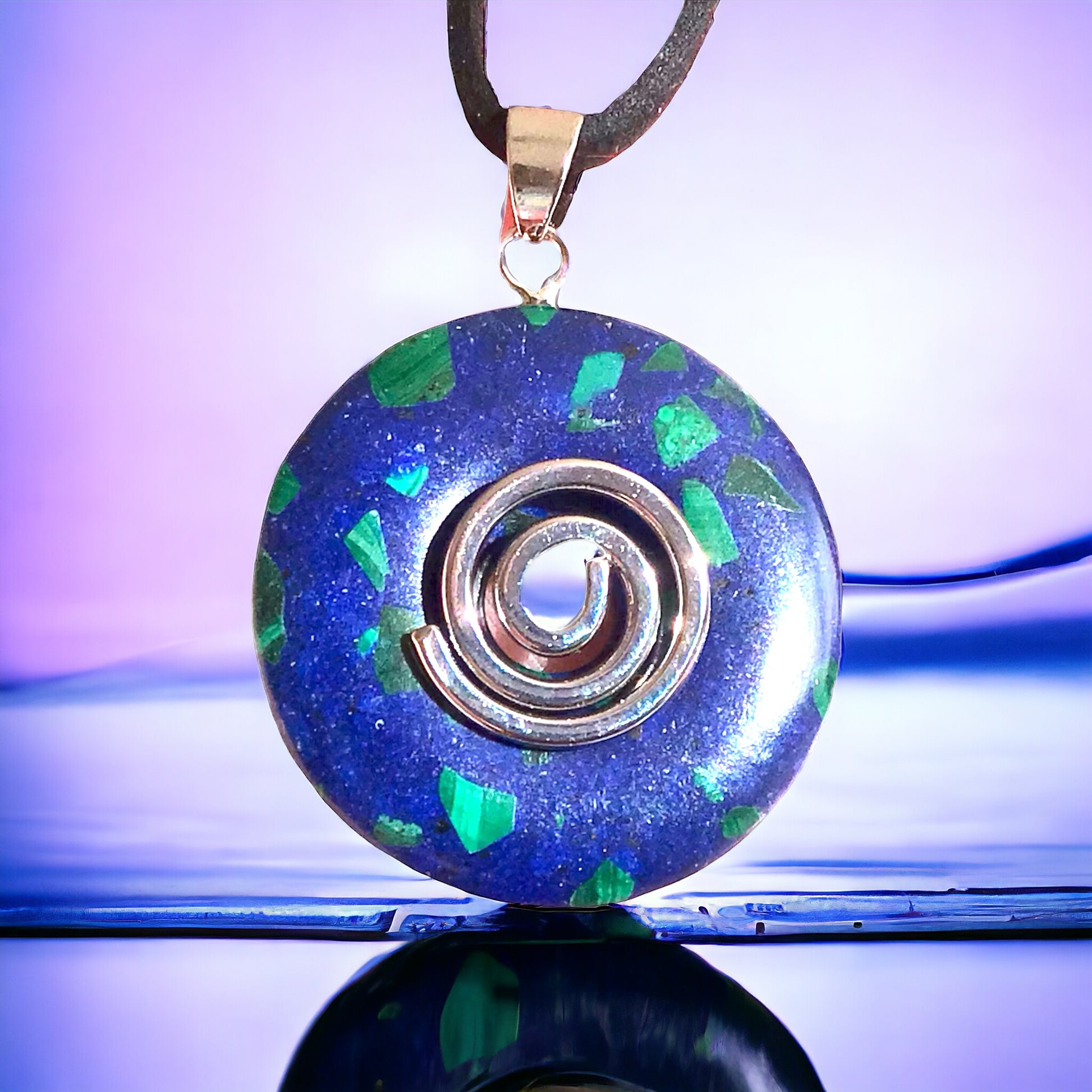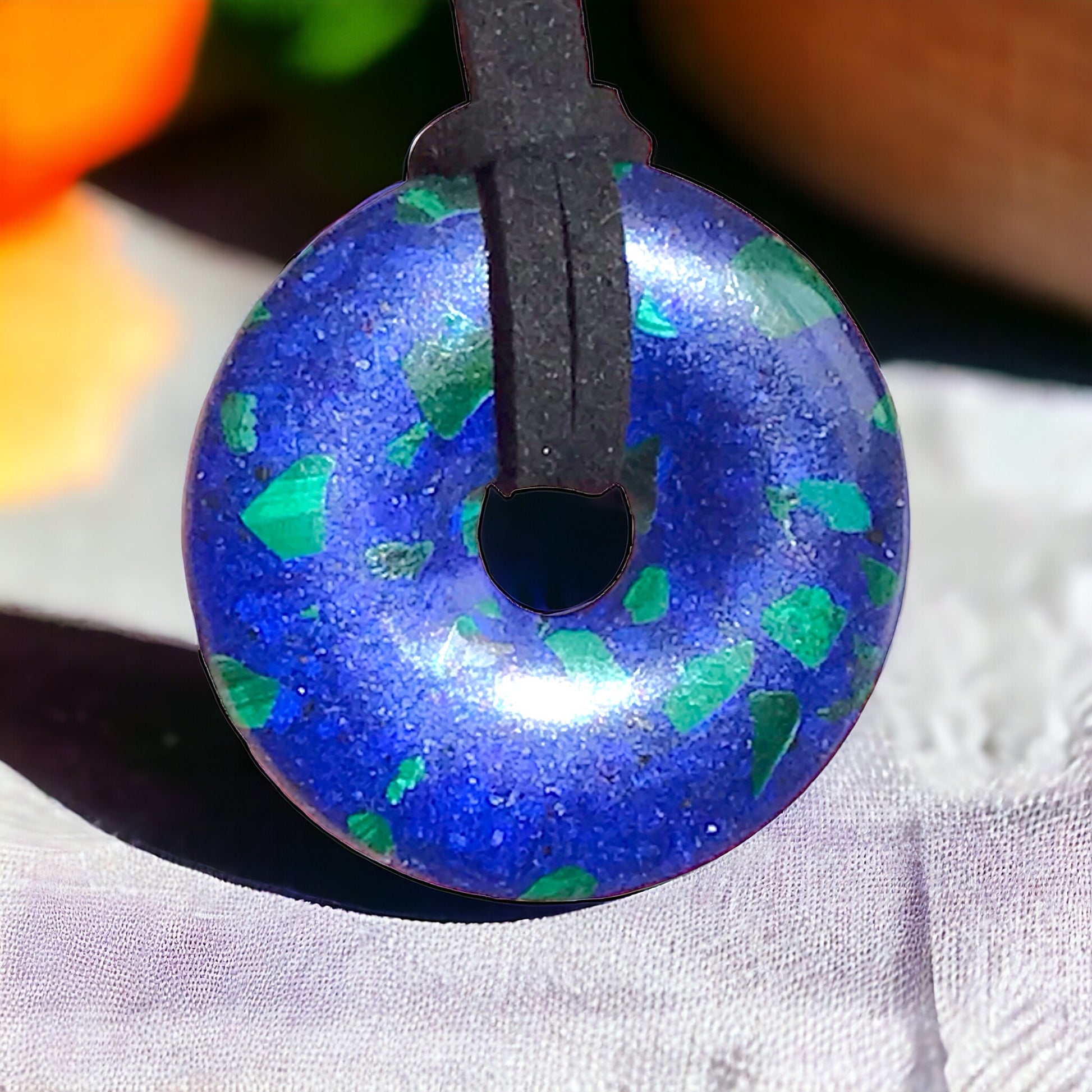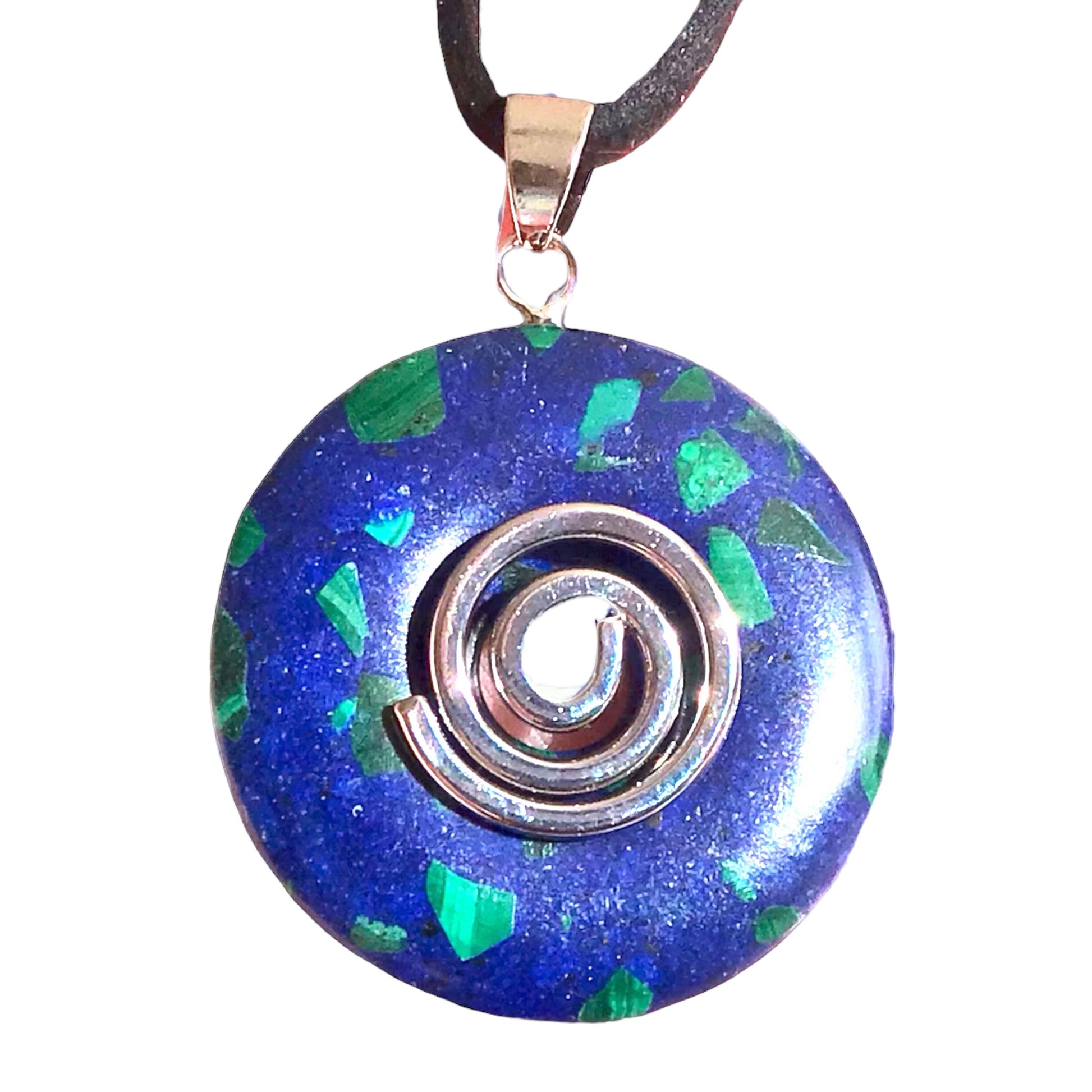 Premium Edelstein-Donut Azurit-Malachit synth. optional als Kette mit versilberter oder vergoldeter Spirale und Wildlederband