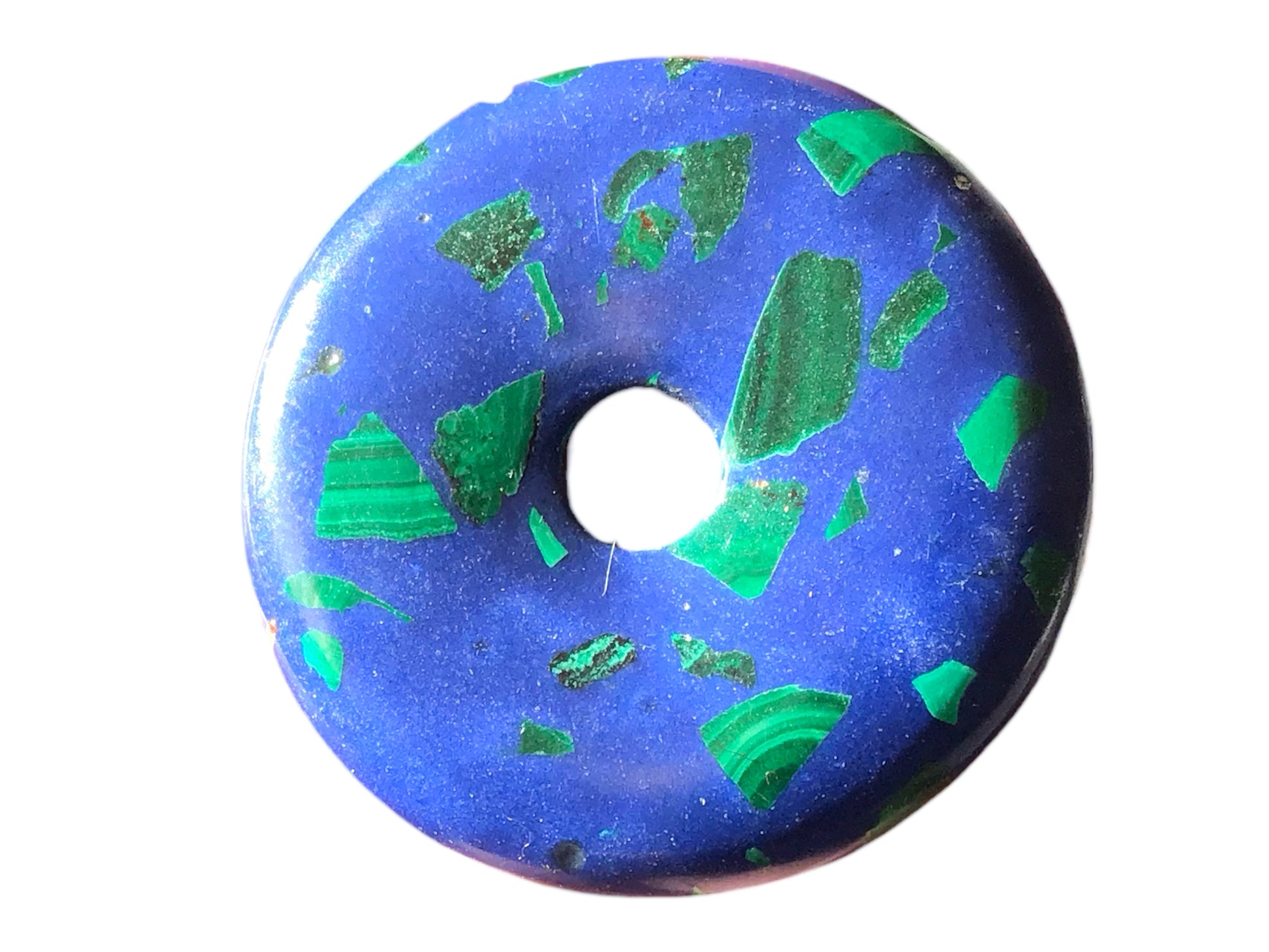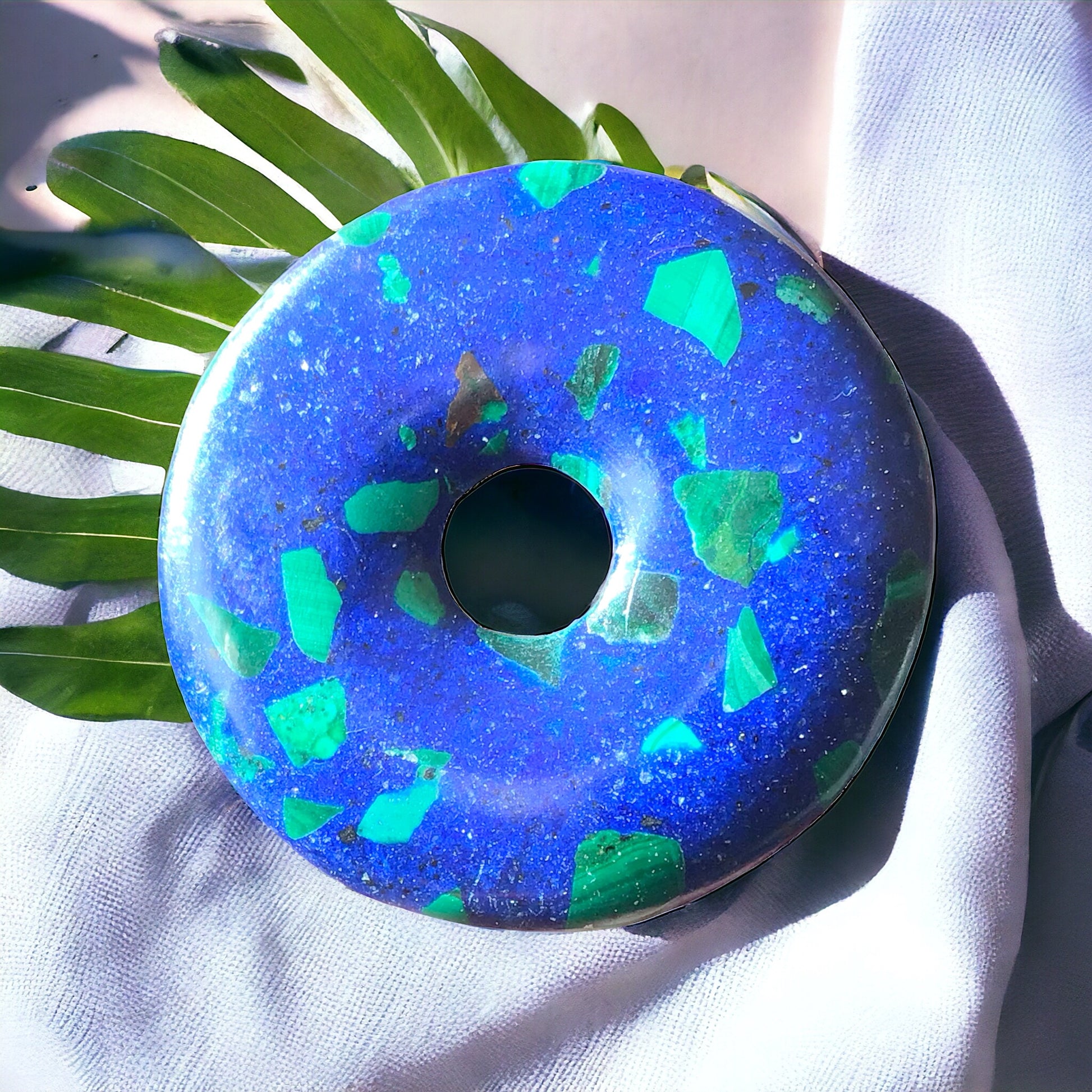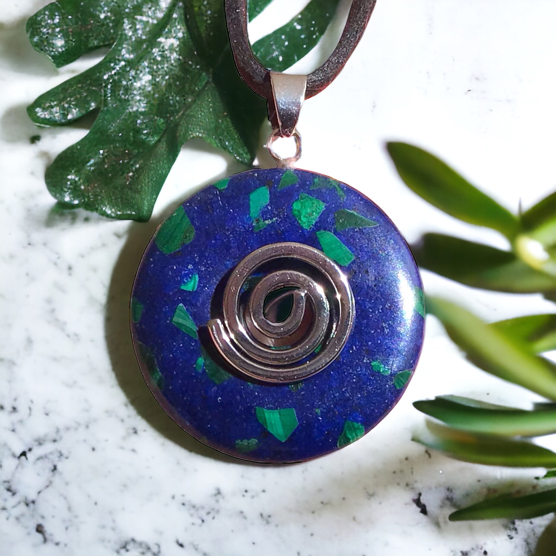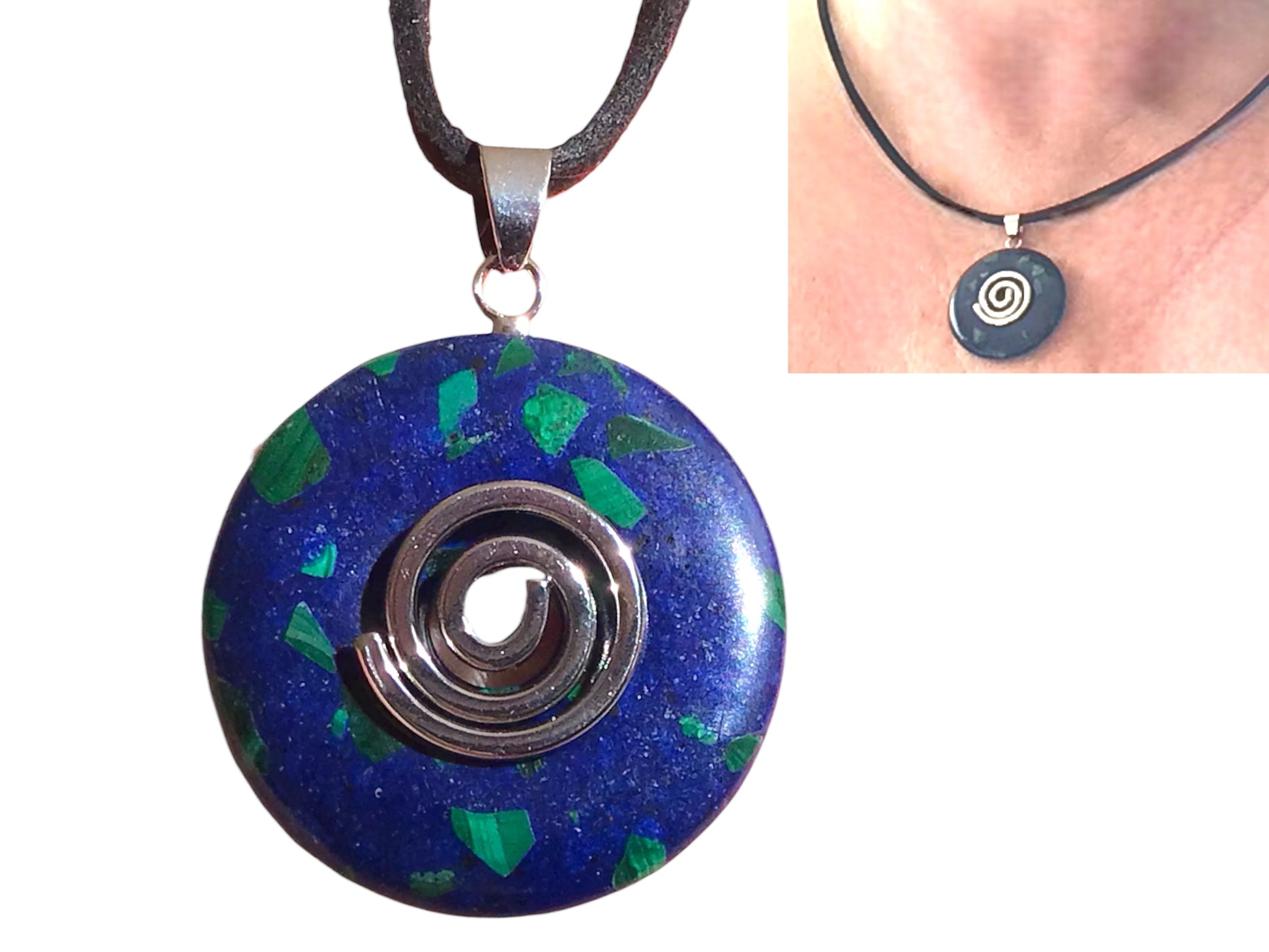 Premium Edelstein-Donut Azurit-Malachit synth. optional als Kette mit versilberter oder vergoldeter Spirale und Wildlederband
