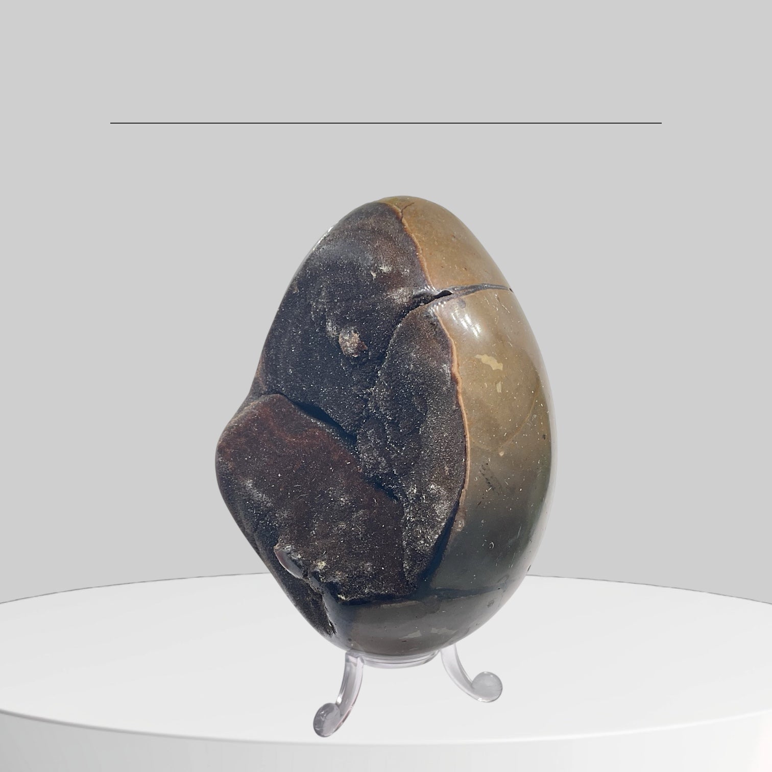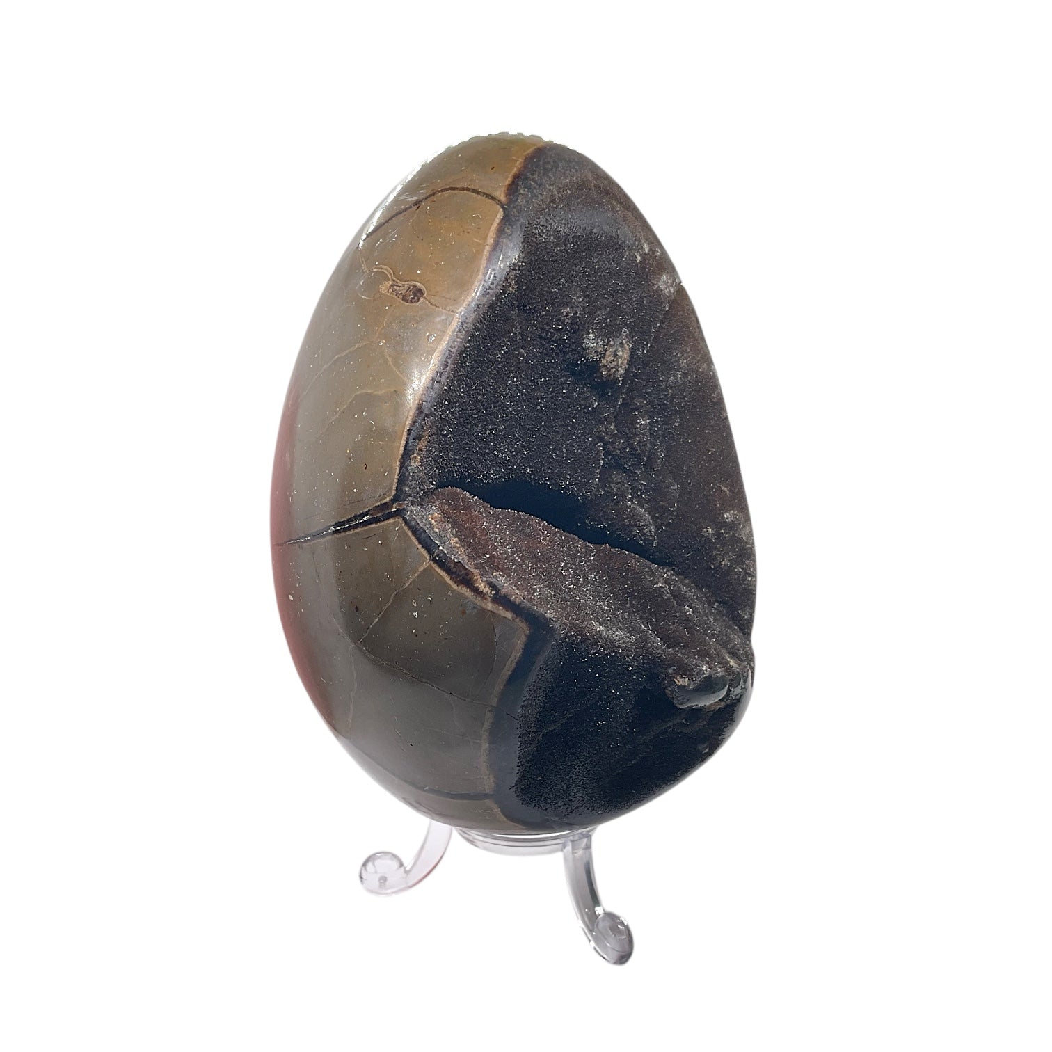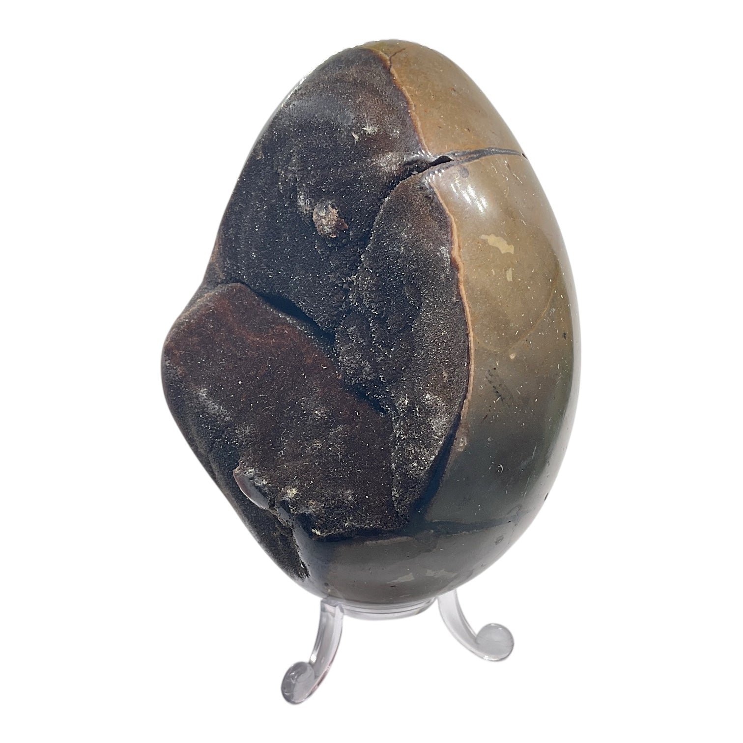 Mystisches Septarien Drachenei | Kristalldruse | Freeform | Unikat-Masterpiece 1631 | 12x8x8 cm | 1022 Gramm | mit Quarzkristall | inclusive Acrylständer I Madagaskar
