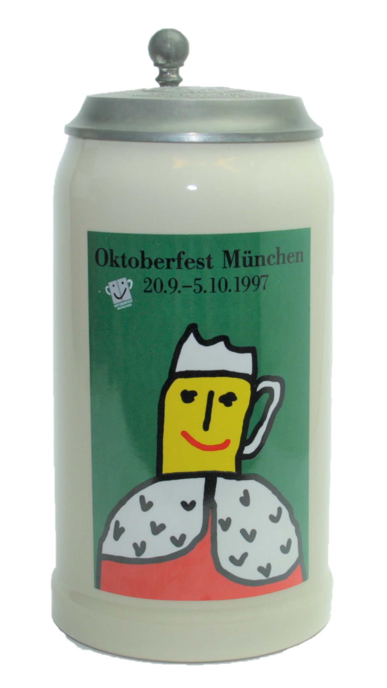 1 Liter Tonkrug mit Zinndeckel, offizieller Oktoberfestkrug zum Oktoberfest 20.09.1997 - 05.10.1997, Jahrgangskrug, Jahreskrug, Wiesnkrug, Sammlerkrug, Wiesndekoration.