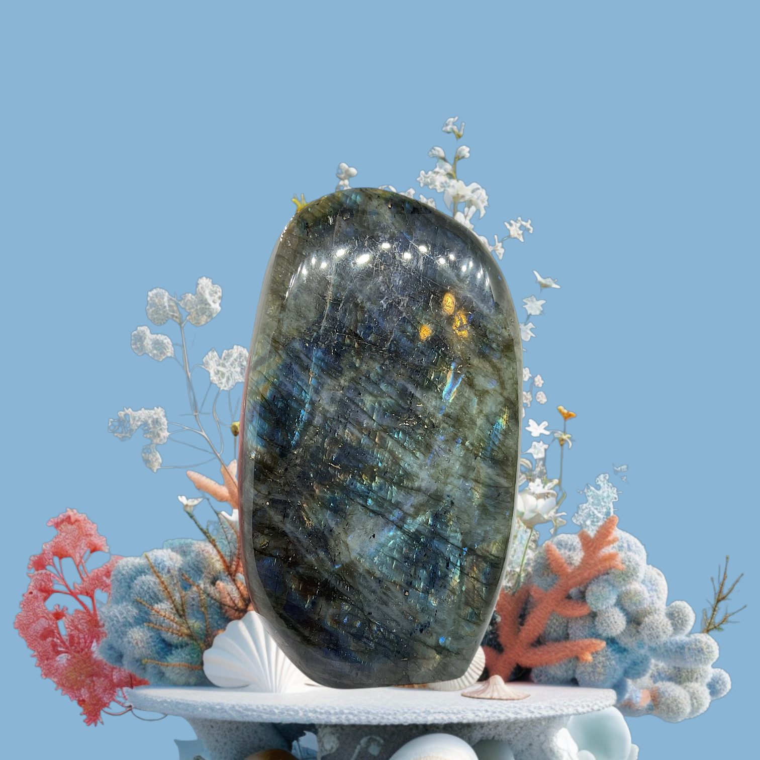 XXL Labradorit Freeform I 9x5x15cm I 1412gr. I Unikat-Masterpiece 1638 I hochglanzpoliert I Sammlerstück I Top 1A-Qualität I Madagaskar